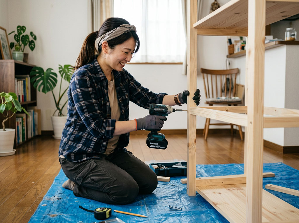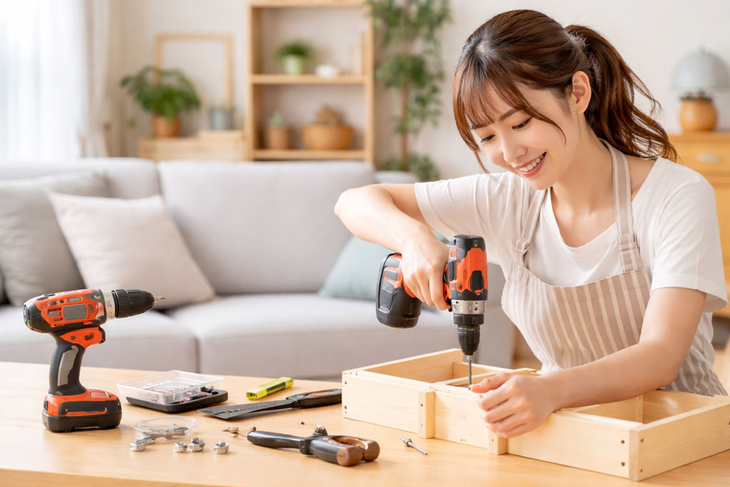 ネジ締めや穴あけの作業を簡単に行えるため、棚づくりや収納DIY、家具の組み立てなど、さまざまな場面で活躍します。